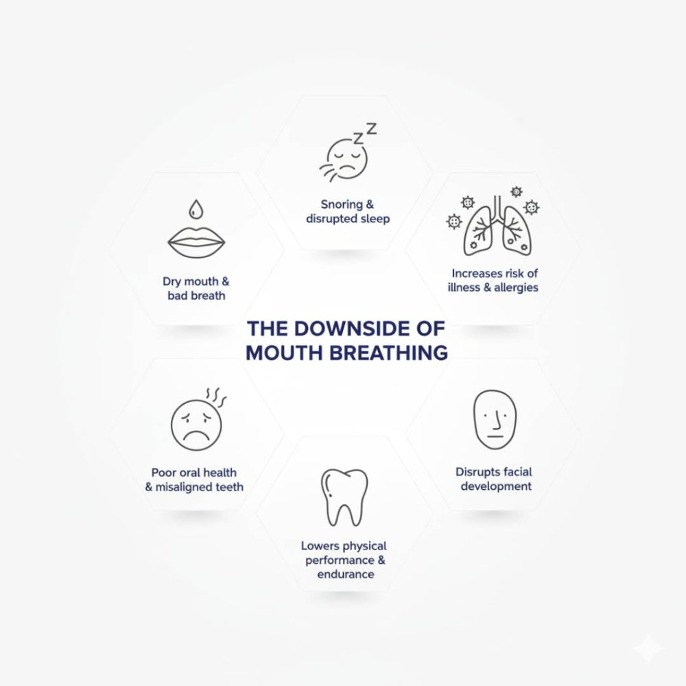Unlike mouth breathing, which causes dryness, dehydration, and fragmented rest, nasal breathing keeps the airways moist and oxygen delivery efficient.